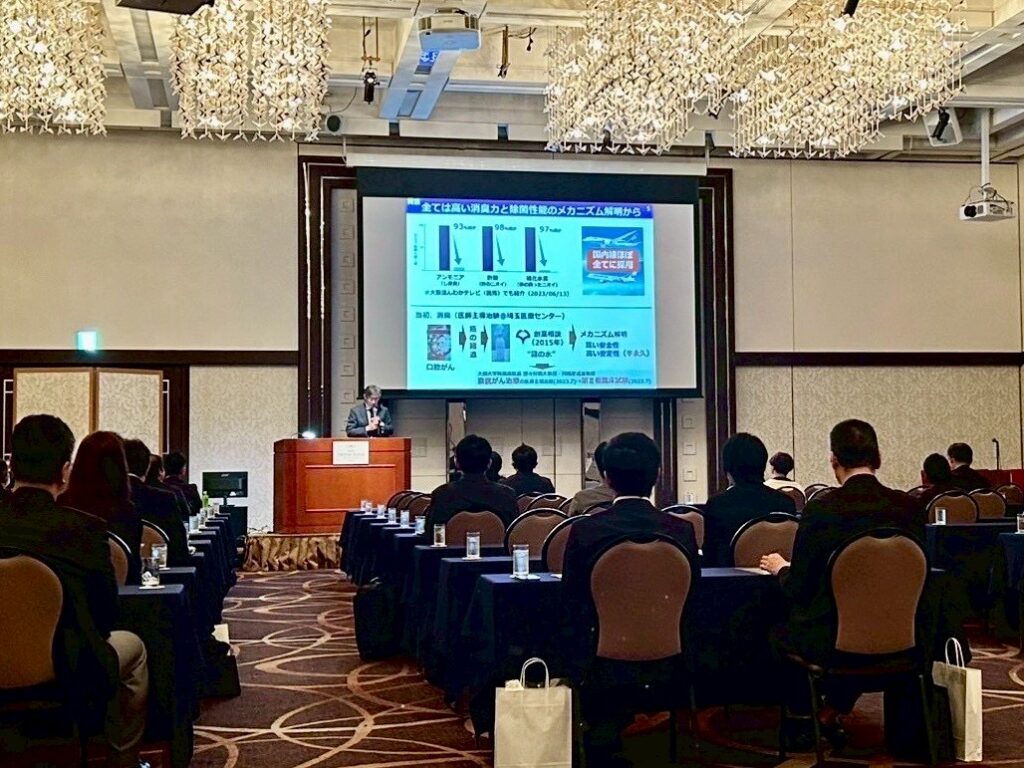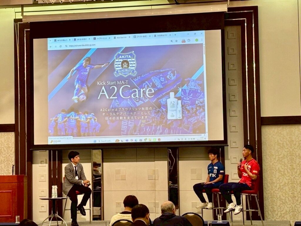 A2Careのパートでは、エーツーケア株式会社 代表取締役 石原嘉文様より、秋田におけるMA-T®の社会実装に向けた取り組みや、地域との連携事例を紹介いただきました。また、サッカーJ2リーグ ブラウブリッツ秋田の藤山智史選手・矢田貝壮貴選手をお招きしたトークセッションを実施し、チームの日常や遠征時におけるA2Care製品の活用方法を、選手の目線でお話しいただきました。スポーツと科学の融合を通じて、MA-T®が地域の健康づくりや環境衛生の向上に貢献できる可能性について、お伝えいただきました。